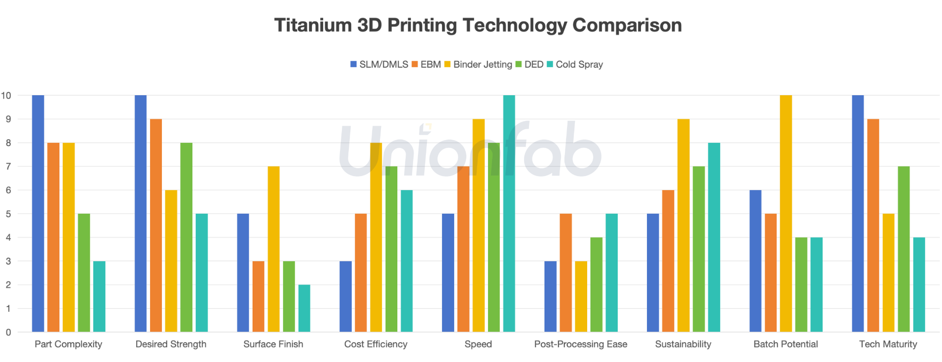 The bar chart below compares how different technologies perform when processing titanium across key performance criteria, helping you identify the most suitable technology for your application.