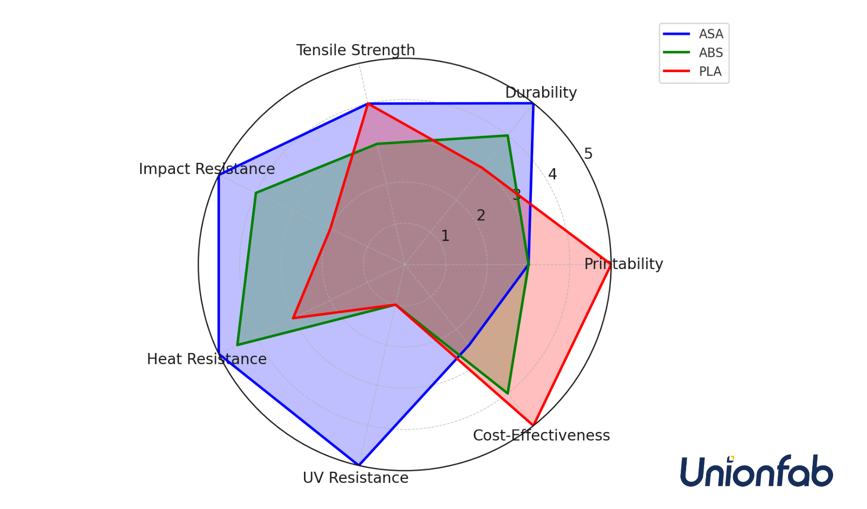 To help you quickly grasp the differences, we’ve highlighted the key performance aspects of ASA, ABS, and PLA in a radar chart below. This visual overview focuses on the dimensions most relevant to real-world applications, making it easier to choose the right material for your needs.